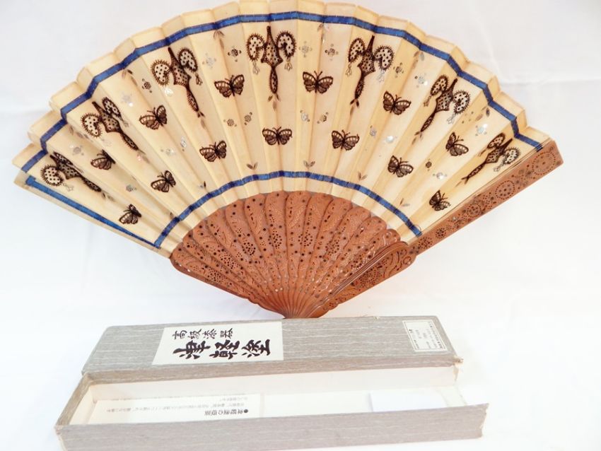 A Chinese wooden brise fan, both guard sticks slightly damaged, embroidered with black butterflies and decorations and sprinkles, in original box with Chinese labels