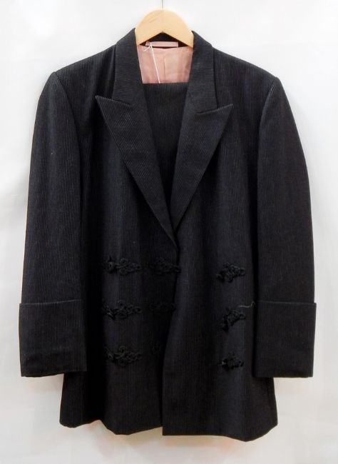 A 1990's Louise Verity original, a lady's black pinstriped suit with frogging detail