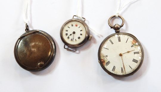 Lady's silver wristwatch (strap missing), silver plated pocket watch (af) and silver miniature compact pendant, Birmingham 1918 (3)