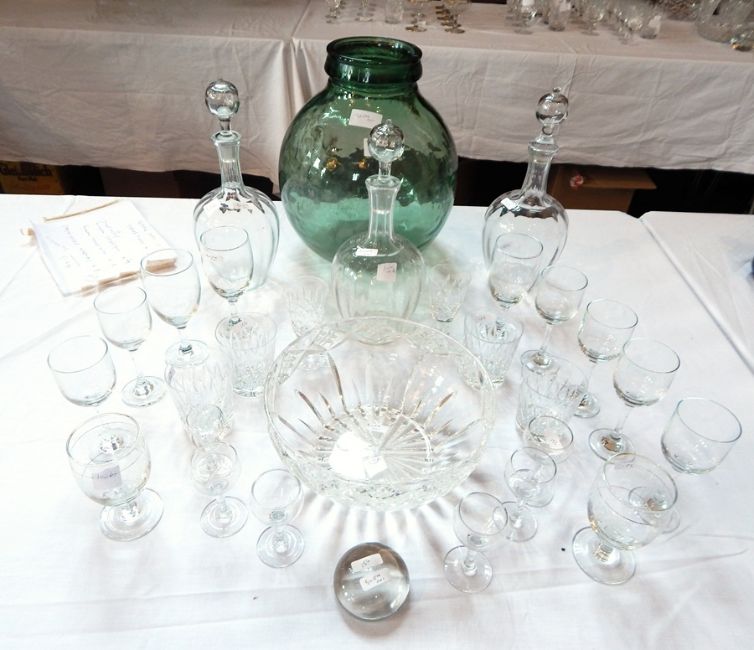 A large green glass carboy, 32cm high, three matching decanters, a cut glass fruit bowl, various sherry and liqueur glasses and a small glass paperweight (28)