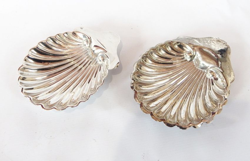 A late Victorian silver sugar bowl with cut card borders, plain form, raised on pad feet, Birmingham 1894, diameter 9cm together with two similar shell-shaped silver dishes raised on ball feet, Birmingham 1898 and London 1903, total weight 7oz approx.