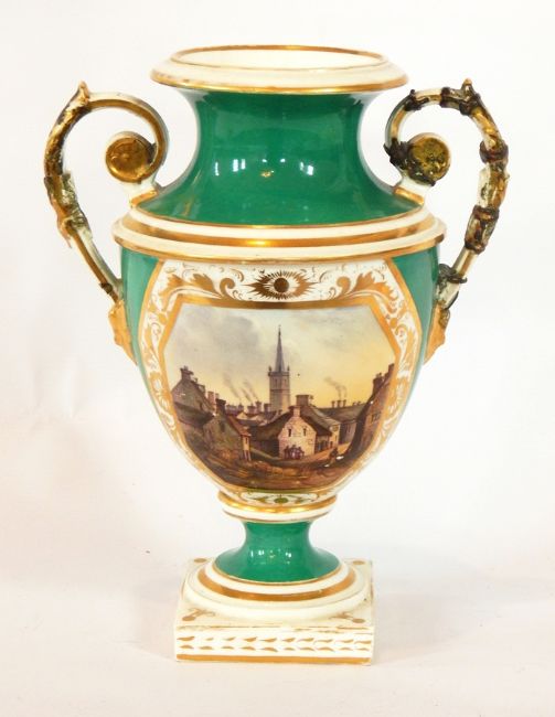 A Derby two-handled vase, village scene with church in background, on an emerald green ground, gilt decorations, on square stepped foot, 23cm high