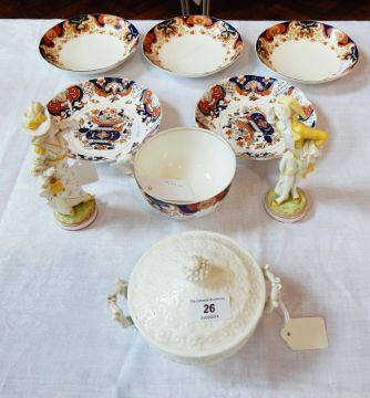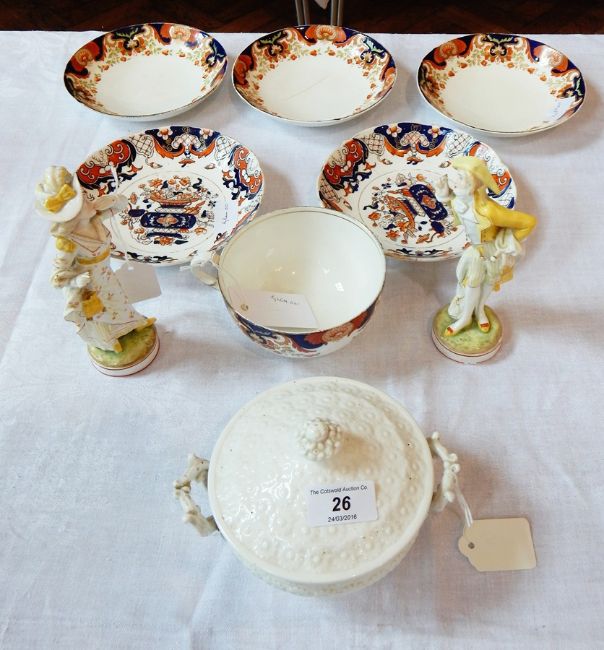 Imari coloured dishes, two continental porcelain figures of a gentleman and lady and other ceramic items (9)