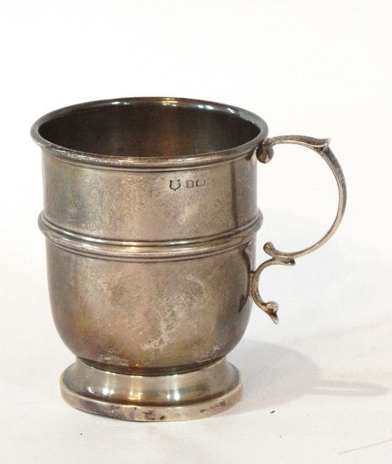 A silver christening mug with raised rim, C-scroll handle, raised girdle, raised on a circular foot, Birmingham (marks rubbed), height 8cm, weight 2oz approx.