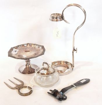 A cut glass and silver lidded jam pot, a silver plate wine bottle holder, adjustable, a small EPNS comport by Harrods of London, a hot plate holder and a meat fork (5)