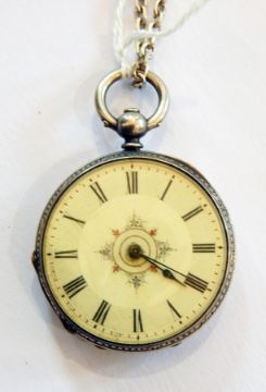 Lady's 9ct gold wristwatch circular with subsidiary seconds dial, on rolled gold pierced strap and continental silver-coloured metal fob watch on white metal chain (2)