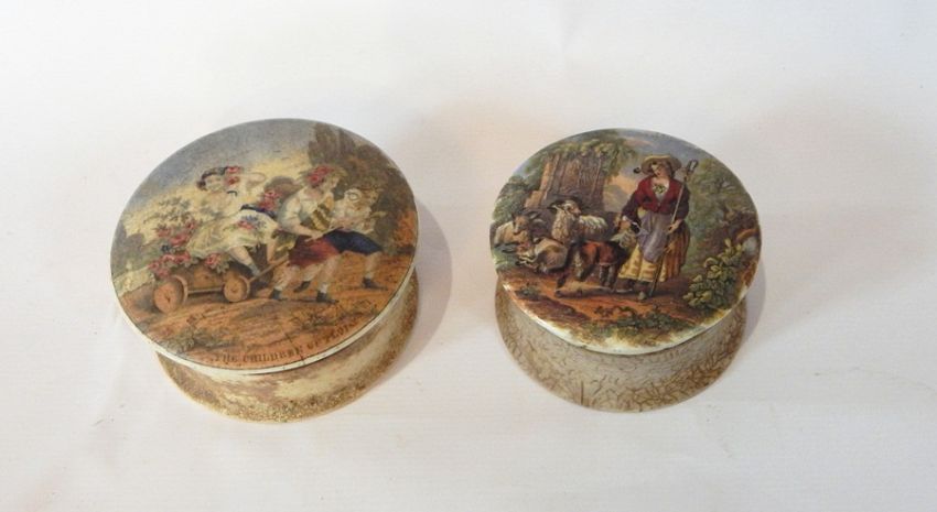 Two pot lids and bases "The Children of Flora", two young boys pulling a girl on a cart, another shepherdess with her flock, an Upchurch pottery bowl and a stoneware ewer (4)