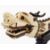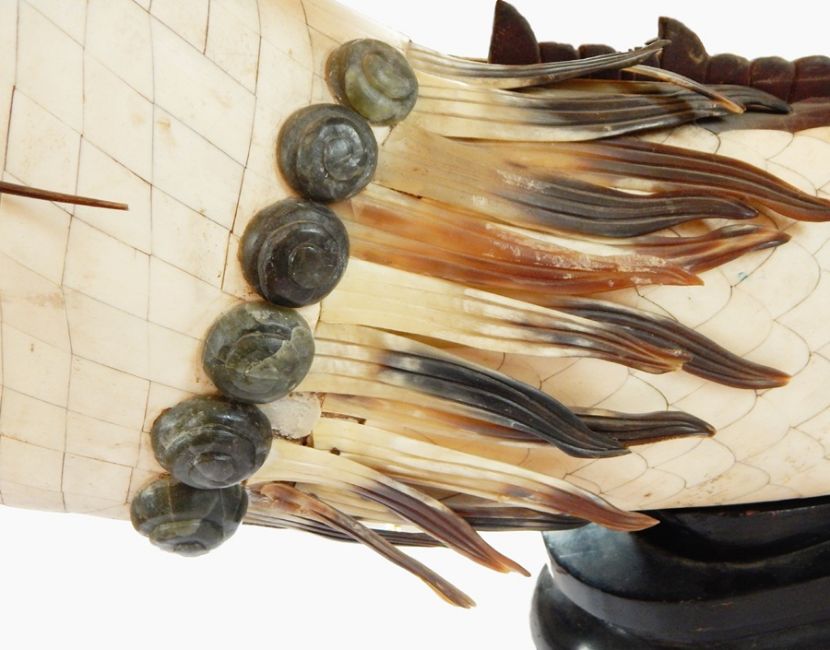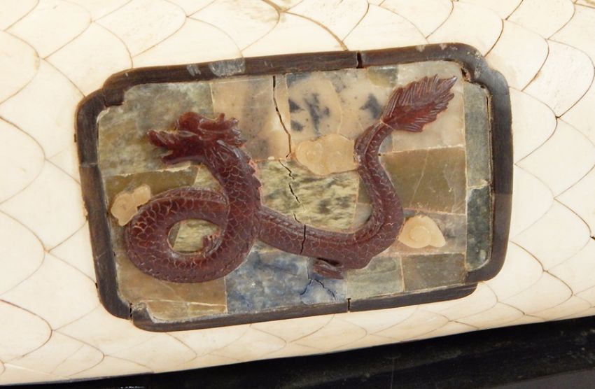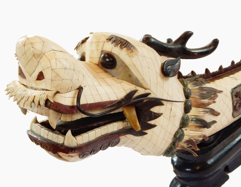 Antique Chinese carved wood, jade and bone stylised dragon model with bone mosaic head with fish scales to body, carved horn and eyebrows, neck and tail, with darker carved horns and ears and whiskers, flaming-type mouth surround, carved stone teeth, spiral circular jade neck detailing, the body having four jade panels to either side depicting raised relief chasing dragons in various poses, the whole supported on shaped carved lacquered rectangular base, 190cm long overall