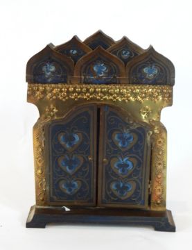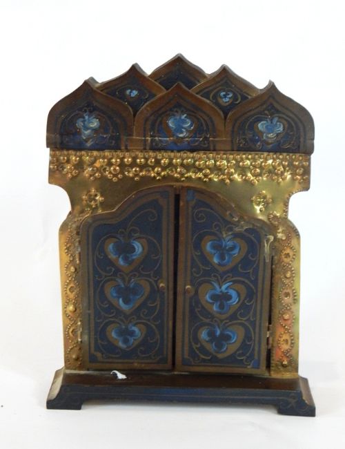 A Polish brass and painted icon, enclosed in a travelling stand with a pair of hinged doors, height 22cm