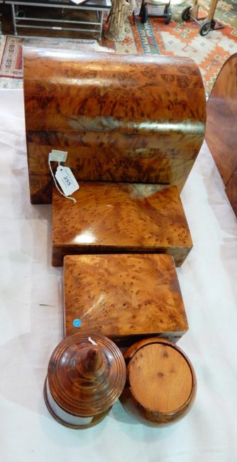 A quantity of Moroccan decorative thuya wood to include dome topped casket, rectangular boxes, coaster sets, etc.