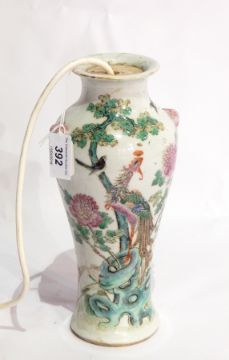 A Chinese porcelain baluster shaped vase converted to table lamp, famille rose palette depicting peacock and birds among foliage, 26cm high