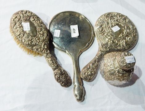 Victorian silver-mounted cut glass scent bottle having silver top and overlay to the shoulders with pierced repousse scroll decoration, Chester 1895, silver-backed hand mirror, Chester 1904, silver-backed hair brush and another silver-backed hand mirror