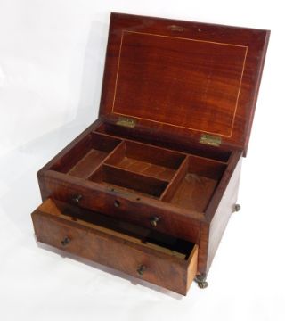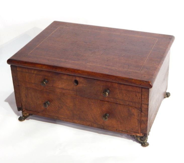 A 19th century inlaid mahogany sewing box, lift top with fitted interior over dummy drawer to single drawer below, on brass lion paw feet