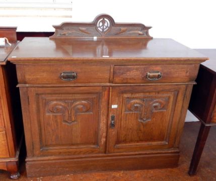 An early Victorian oak sideboard with art nouveau style carving, two frieze drawers with carved panel cupboards below enclosing shelf on a plinth base, width 122cm