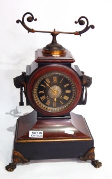 A Victorian red and black marble mantel clock, with ring handles and paw feet, the black dial with gold Roman numerals signed J T Barry, Cardiff, eight day striking movement, height 36cm
