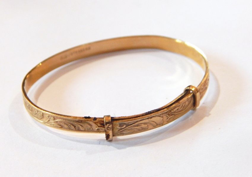 A string of graduated cultured pearls, two small silver cross pendants and a child's rolled gold expanding bangle