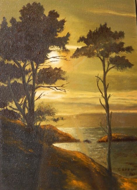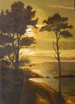 Oil on board, coastal scene with sunset, 39 x 29 cms