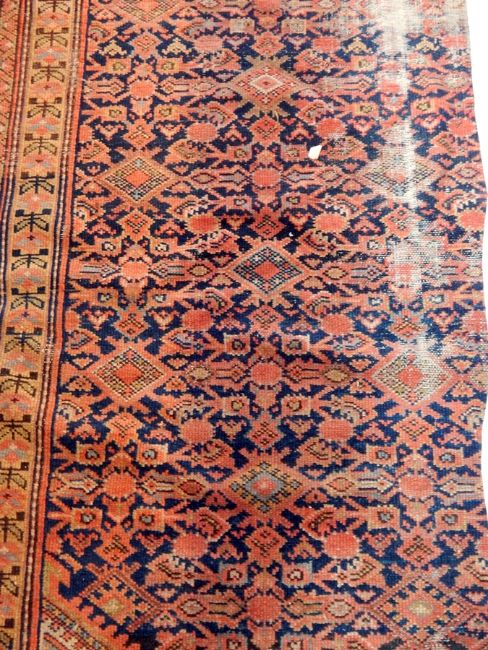 A Persian style rug with blue ground, geometric pattern, cream guard fences and red border, 190cm x 335cm and another