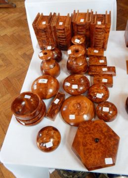 A collection of Moroccan decorative thuya wood to include hexagonal lidded pot, bowls, etc.
