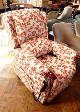 An electric reclining chair with white ground and covered with orange floral fabric