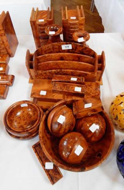 A collection of Moroccan decorative thuya wood to include letter rack, bowls, etc.