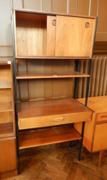 A modern unit the top with sliding doors enclosing adjustable shelf, with open shelf below, frieze drawer and further shelf raised on steel supports (Avalon furniture), width 84cm