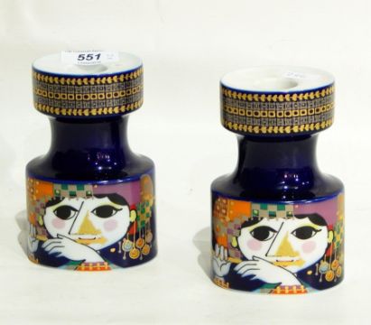 A pair of Rosenthal candle holders designed by Bjorn Wiinblad, decorated with faces and geometric bands, on blue ground, 13.5cm high
