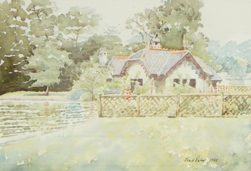 Frank Palmer Watercolour drawing Cottage in garden Body colour "On the Nile" H Nelson Watercolour and body colour Quayside scene and two other pictures (5)