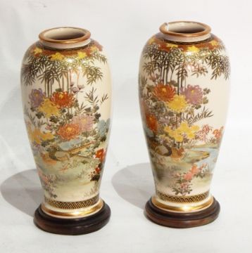 A pair of Satsuma vases , decorated with chrysanthenums and game birds 20 cms high with wooden stands.