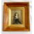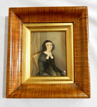 Pair watercolour miniatures Victorian lady and gentleman, the lady wearing black dress with white ribbon and long gold guard chain, seated, the gentleman wearing blue waistcoat and blue cravat, each 10cm x 18.5cm
