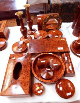 A pair of Moroccan thuya wood turned candlesticks, a backgammon board, four circular boxes and covers and various other items (17)