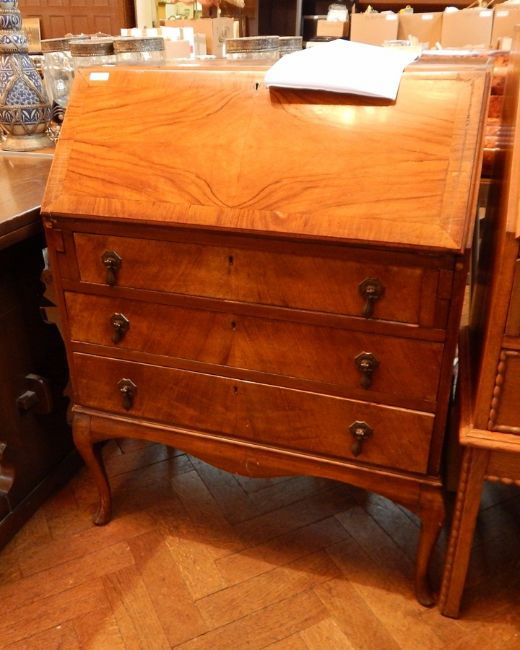 A mahogany bureau with three graduating drawers, on cabriole legs, fitted interior, 176cm wide