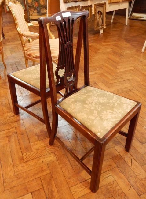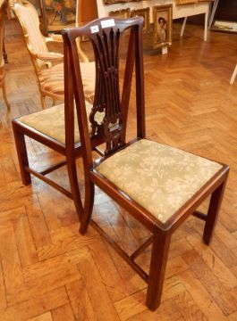 A pair of mahogany Chippendale style dining chairs with open splat backs, upholstered drop in seats on square legs united by stretchers