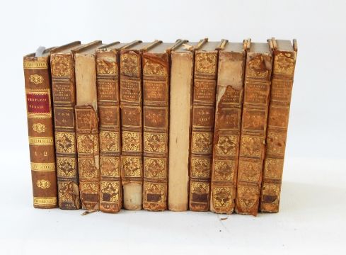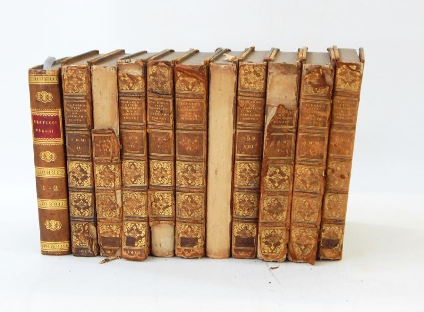 Canovai, Stanislav "Viaggi di Amerigo Vespuggi...", Fierenze (1832), frontis portrait, 2 vols bound as 1, Bkpl inside front cover, rebound, marbled bds, quarter-leather, red pastedown, gt decorations to spine, all edges speckled with "Le Vite Degli Uomini Illustri di Plutarco...", Milano (1817), 10 vols, full leather, backstrips chipped with loss (11)