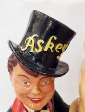 An Askeys advertising figure with a gentleman in top and tails holding a large ice cream cone, "20th April 1897, Founder of Regent Milk Bar, Mr B Alfred, born in South America, San Paolo", 67cm high