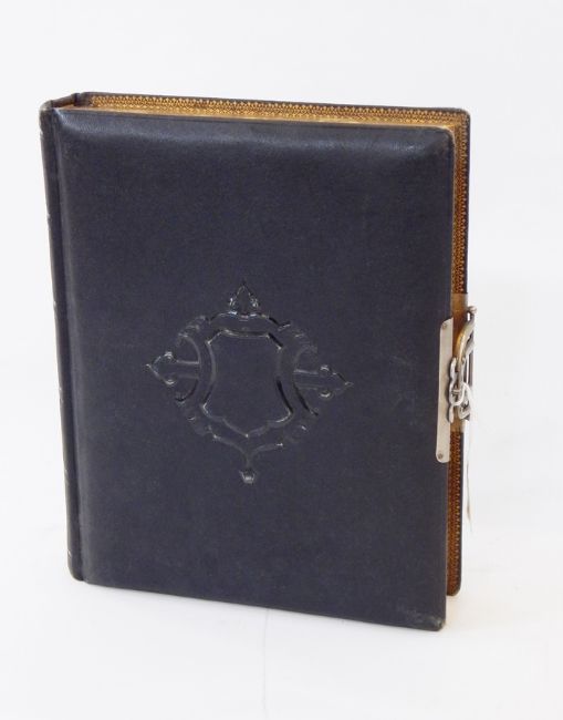 Victorian leather bound carte-de-visite album, some with handpainted floral decoration, tooled leather edging with white metal clasp