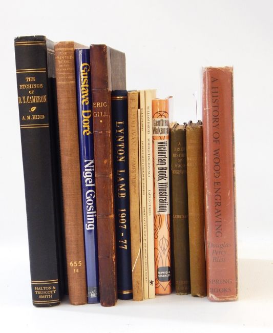 A quantity of books on woodcut and wood engravings incl:- Bliss, Douglas Percy "A History of Wood-Engraving", Spring Books (1964), numerous ills, red cloth, dj O'Connor, John "The Technique of Wood Engraving", B T Batsford (1971), black cloth, dj, not pc Cundall, Joseph "A Brief History of Wood-Engraving...", Sampson Lowe (1895), numerous ills, green cloth, gilt titles, blindstamped image in black on front board and another similar copy Cole, Alphaeus P and Cole, Margaret Ward "Timothy Cole Wood Engraver", Pioneer Associates, New York (1935), No.493/750, numbered and autographed copies by both authors, blue cloth, gilt titles, dj Keane, Laurence "William Barnes, The Somerset Engravings", "William Barnes, The Dorset Engravings", limp covers Thorpe, Joseph "Eric Gill", Jonathan Cape (1929), photographic frontis, various plates, half-leather, raised bands, gilt title Brewer, Roy "Eric Gill, The Man Who Loved Letters", Frederick Muller Ltd (1973), blue cloth with silver titles and portrait to front board, dj and various other related vols.