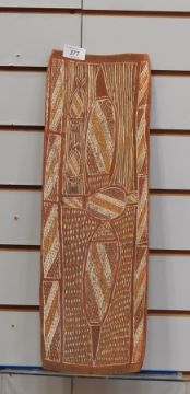Ray Mayel Aboriginal art on bark, decorated with traditional aboriginal artwork to include fish and dots, 55cm