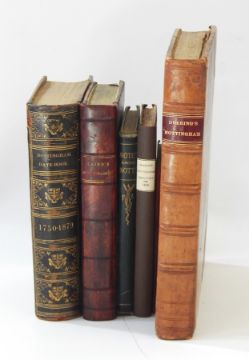 Nottingham Interest Deering, Charles MD "Nottinghamia Vetus et Nova or An Historical Account of the Ancient and Present State of the Town of Nottingham...", George Ayscough and Thomas Willington (1751), folding frontis, numerous plates and folding plates, rebound, contemporary leather laid down on bds, backstrip with raised bands, red pastedown and gilt titles Laird, F C "A Topographical and History Description of Nottinghamshire...", Sherwood, Neely & Jones (1810), engraved plates, frontis offset on title page, some foxing, rebound, contemporary leather laid down, yellow edges "The Date-Book of Nottingham 1750-1879", H Field (1880), contemporary binding, half-leather, Nottingham Coat of Arms to front board White Francis & Co "History, Directory and Gazateer of the County... of Nottingham", printed for the authors (1853), rebound with contemporary blindstamped leather laid down to bds, rebacked, gilt titles White, William "History Gazateer and Directory of Nottinghamshire...", printed for the author (1832), rebound, contemporary leather laid down on bds, rebacked with gilt titles and date White, Francis & John "Nottinghamshire, History, Directory and Gazateer of Nottingham 1844", full-leather, backstrip worn and four other related vols (10)