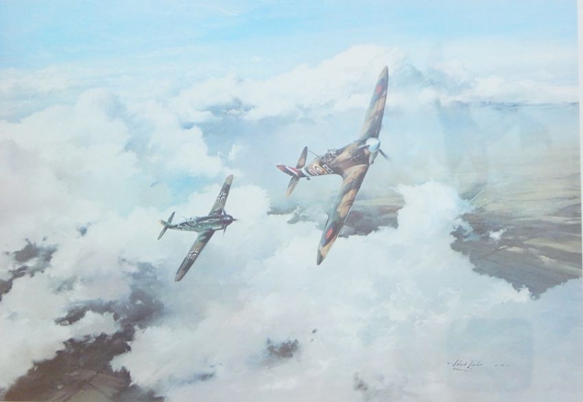 Colour print after Robert Taylor "Duel of Eagles", to commemorate the 40th anniversary of the Battle of Britain, signed by Douglas Bader and Adolf Galland, 37.5cm x 51cm