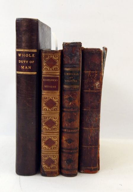 Venn, H "The Complete Duty of Man...", Edinburgh, D Schaw (1803), engraved vignette on tp, marbled ep, full leather, blindstamped, gt rules Klopstock, Frederic Gottlieb "The Messiah... of our Lord and Saviour, Jesus Christ", London, stereotype edition (nd), full leather, backstrip with gt decorations and rules, raised bands and titles Zimmerman, John George "Solitude or the Effects of Occasional Retirement...", London (1827), pls crayon annotations, some staining, marbled bds, marbled ep, half-leather and Atmore, Rev Charles "The Whole Duty of Man: or the Christians Companion...", Liverpool (1811), pls, water stains throughout, rebound, contemporary leather laid down on bds, rebacked, gt title on pastedown (4)