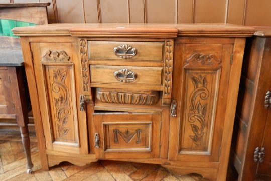 A Victorian walnut breakfront sideboard with two flanking cupboards and two drawers and under cupboard, carved and floral decoration, 120cm wide