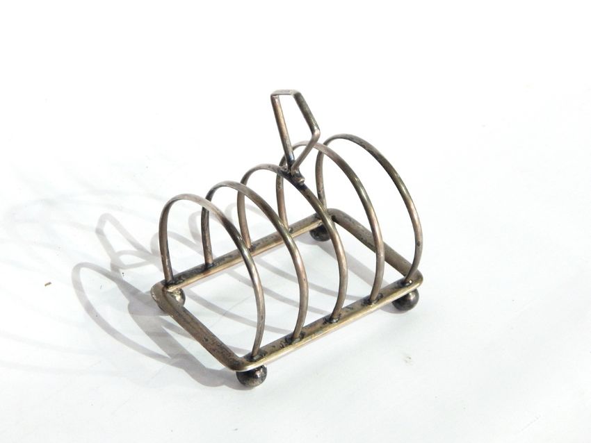 A silver four-division toast rack, Birmingham 1924 and a tea strainer, Birmingham 1960 (2)