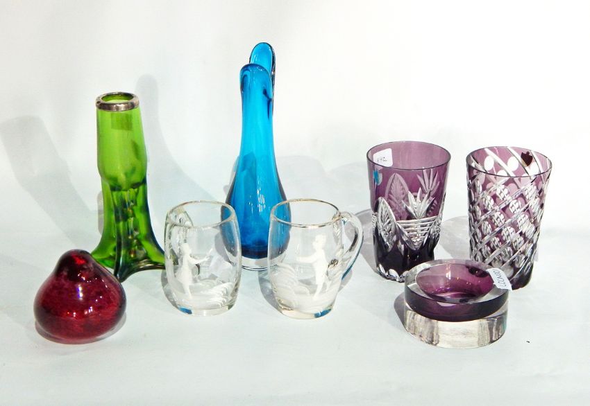 Quantity of decorative glassware including Swarovski animals, paperweights, amethyst cut glass vases, tumblers, pair of Kate Greenaway style enamel decorated glass mugs etc.