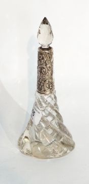 A glass tapering scent bottle with foliate white metal collar and stopper, height 19cm
