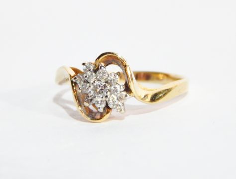 A gold crossover diamond ring, the centre set with an elongated cluster, marked 14K