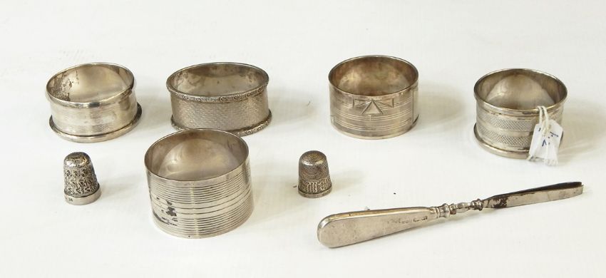 A silver napkin ring by Mappin & Webb, four further silver napkin rings, two silver thimbles and a silver-handled pair of tweezers (8)
