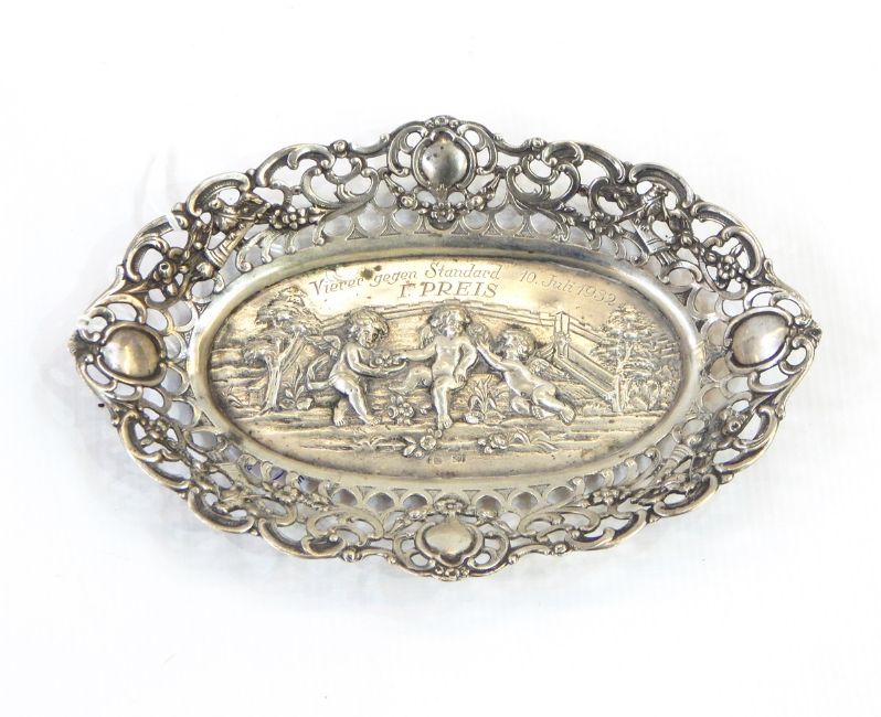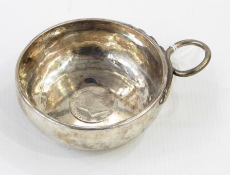 A French silver ecuelle with an 1813 coin mounted to the base, loop handle, another ecuelle and an 800 standard silver pin dish of oval form with pierced border and decorated with cherubs (3)