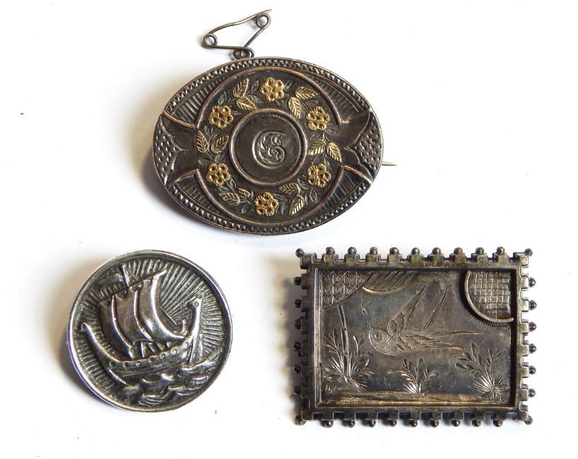 A Scottish silver circular brooch depicting a ship, by Robert Allison, Glasgow 1952 and two Victorian silver brooches