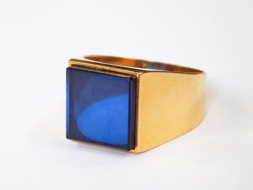 Gent's gold-coloured metal (stamped 18K) and blue stone signet ring set single square blue stone, approx. 10g total